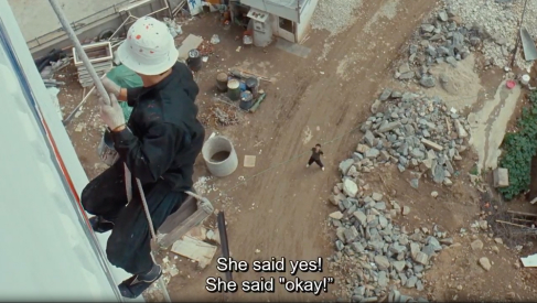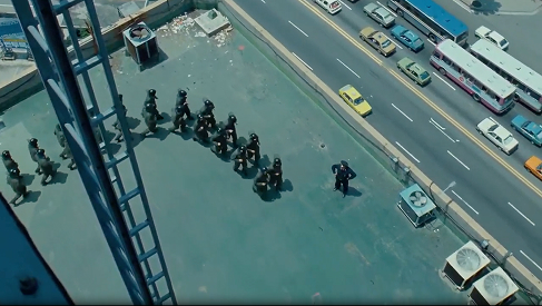 Особенно ярким моментом становится финальная сцена, где главные герои демонстрируют «протест». Пространство превращается в зону конфликта между системой и человеком. Это подчеркивается тем, что камера движется вверх и вниз, демонстрируя разрыв между людьми, стоящими внизу — полицией и прохожими, — и героями, оказавшимися наверху, на высоте, которая несет не победу, а лишь отчаяние.
