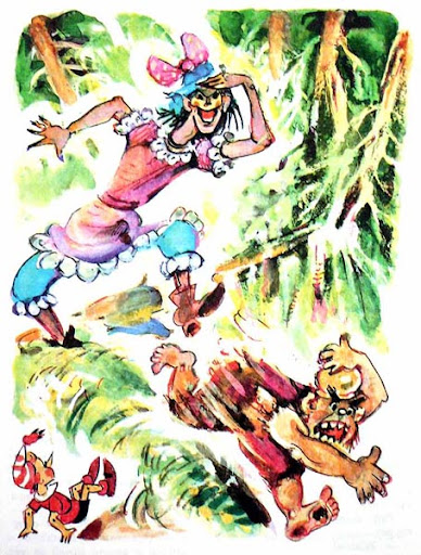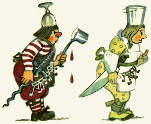 Людоеда Владимирский изобразил не злым, а наоборот добрым и улыбчивым. Персонаж представлен как одичавший пират-каннибал, с круглой серьгой в ухе и костью, которая вплелась в пучок волос на макушке.
