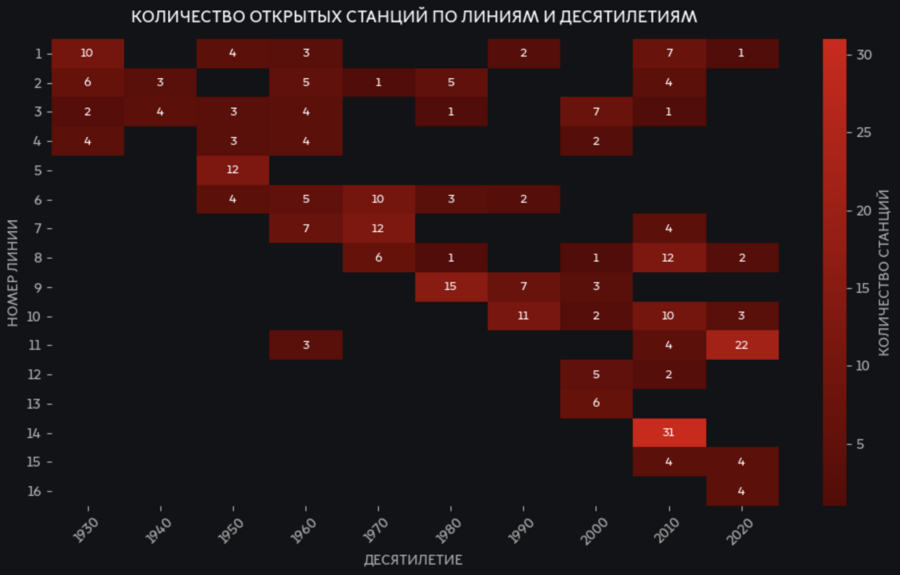 График № 1: Тепловая карта. Количество открытых станций по линиям и десятилетиям