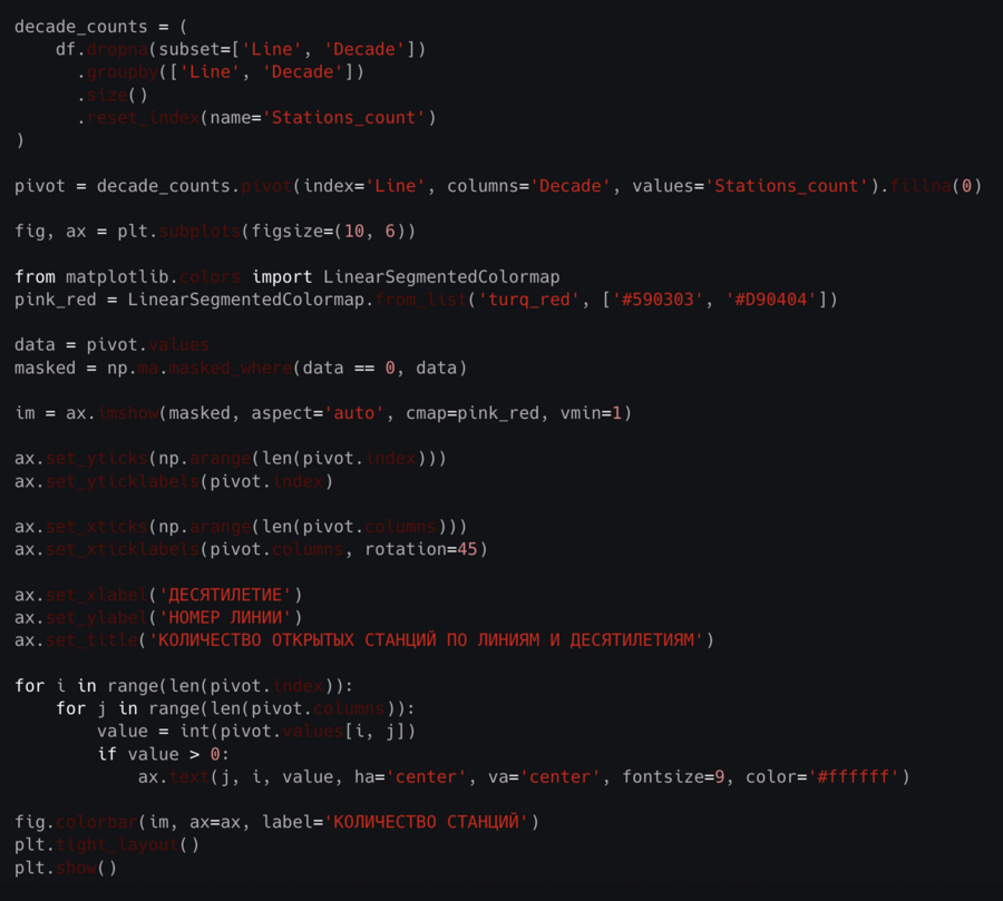 • Геопространственный анализ Реализован с использованием координат широты и долготы для визуализации расположения станций на карте города и анализа пространственного распределения линий метро.