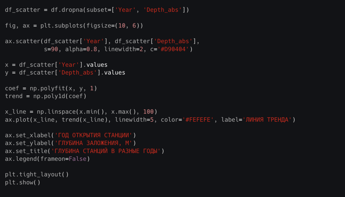 После того как я узнала динамику открытия станций, мне, исходя из имеющихся в датасете данных, захотелось понять, как со временем менялась глубина заложения станций Московского метро. Для этого я построила точечный график, где каждая станция отображается по году открытия и глубине заложения, а также добавила линию тренда для выявления общей тенденции.