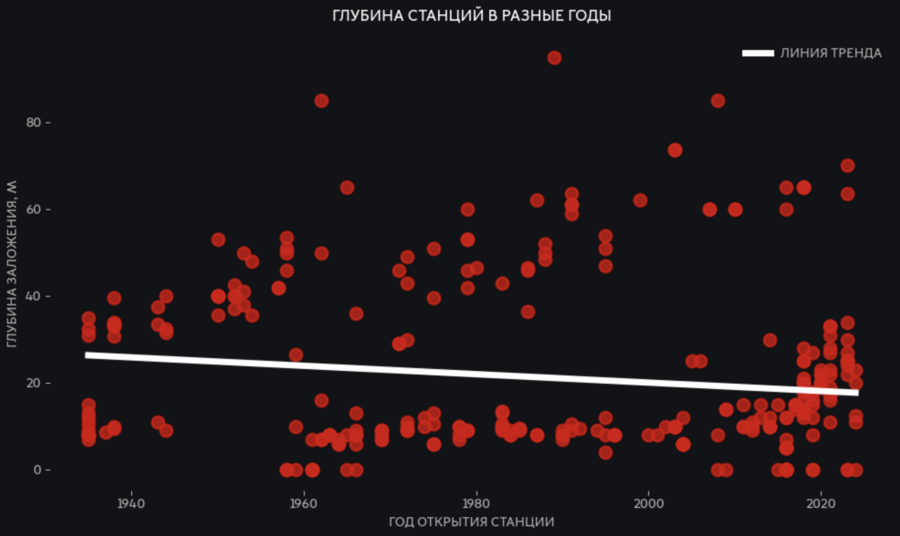 На графике видно, что на протяжении всего времени глубина станций редко превышала 60 метров. При этом в 2000–2020-е годы большинство новых станций закладываются на меньшей глубине по сравнению с более ранними десятилетиями: лишь в отдельных случаях глубина превышает отметку в 40 метров, что указывает на преимущественное смещение строительства в сторону менее глубоких станций.