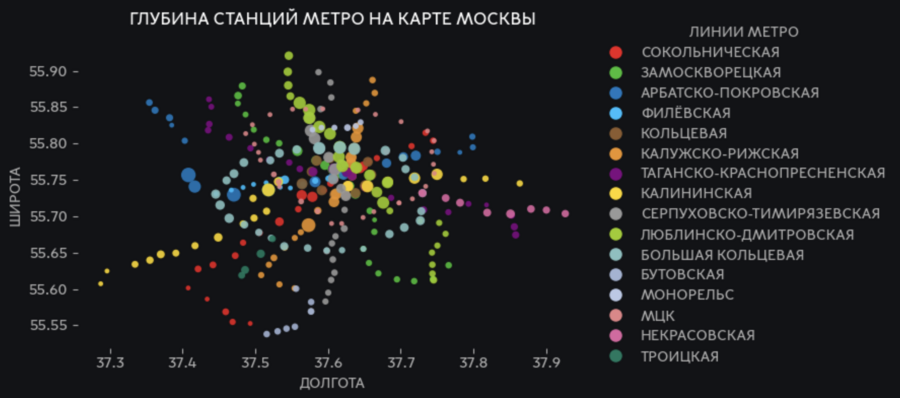 Имея данные о глубине заложения станций, мне стало интересно визуализировать их в формате, близком к привычному восприятию карты метро, но с сохранением реального географического расположения. На графике каждая станция обозначена точкой, при этом размер точки напрямую зависит от глубины заложения станции.