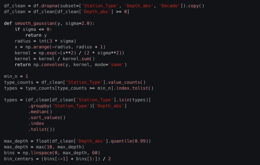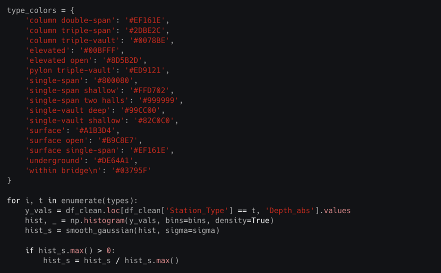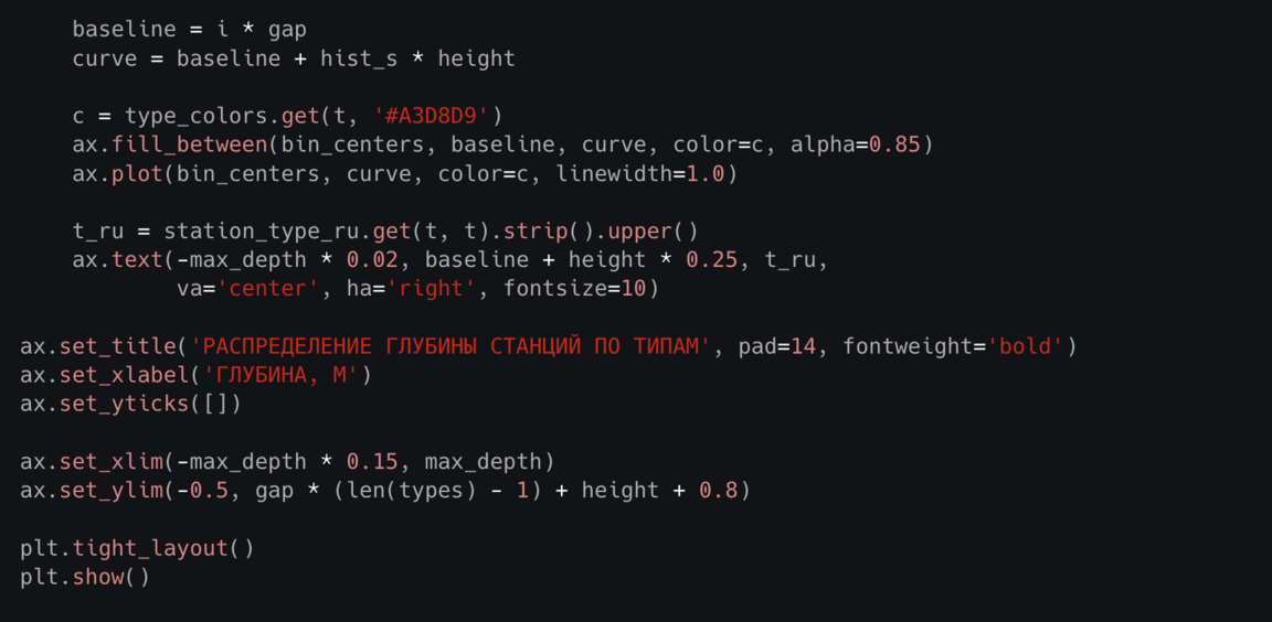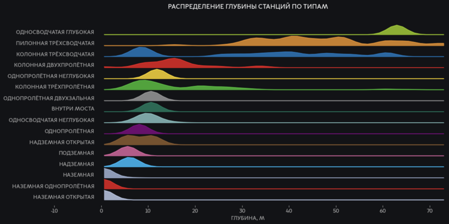 • Анализ распределений Использовался для сравнения глубины заложения станций разных архитектурных типов и выявления характерных диапазонов значений.
