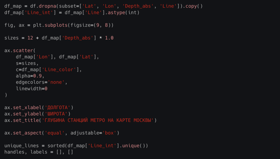 Точки расположены в соответствии с географическими координатами станций и окрашены в цвет линии Московского метрополитена, к которой они относятся. Такая визуализация позволяет одновременно увидеть пространственное распределение станций, структуру линий и различия в глубине заложения.