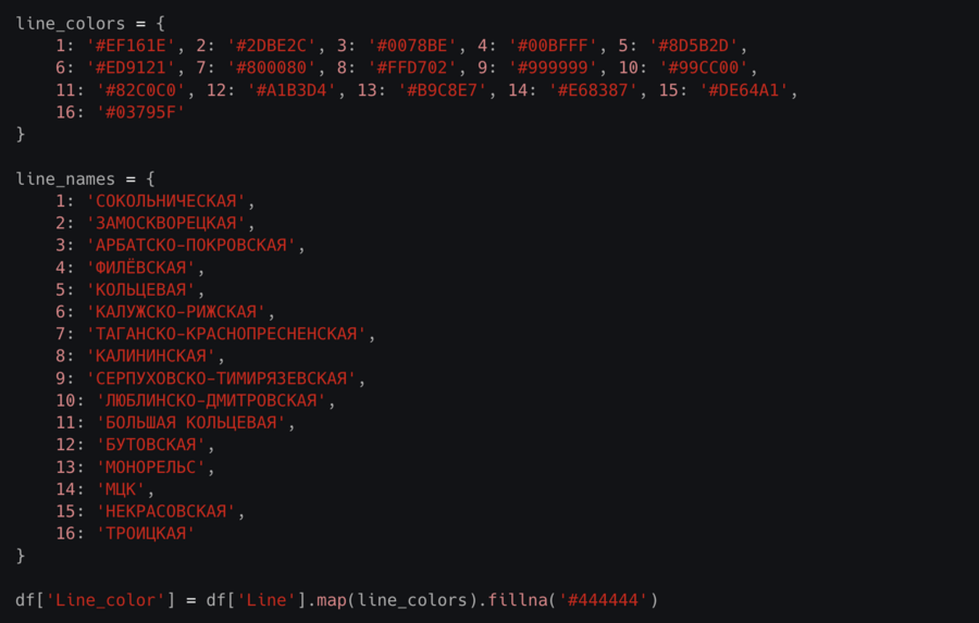 Для следующих двух графиков цветовая палитра была сознательно изменена, ввиду необходимости использования большого количества цветов для удобства восприятия и интерпретации результатов на графиках. Цвета выбраны не случайно — они соответствуют линиям Московского метрополитена.