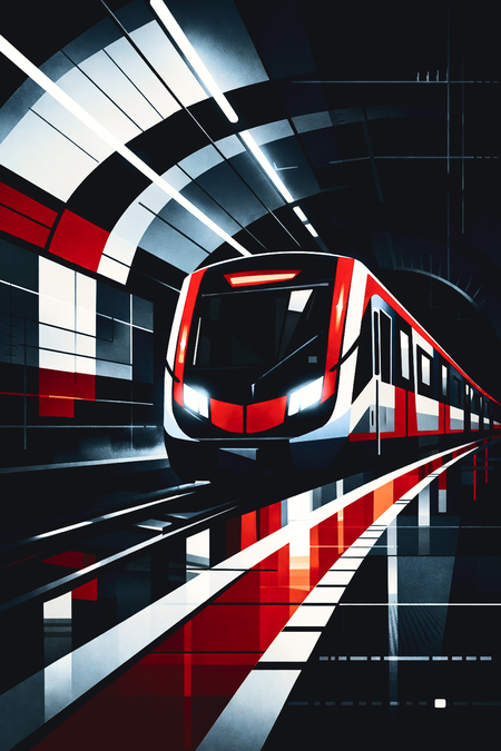 3. ChatGPT — для помощи в написании и корректировке кода, также для генерации оболожки проекта. Промпт: Modern graphic poster of a contemporary Moscow Metro train, dynamic angle in a dark tunnel. Near-black background, high contrast, bold clean shapes. Bright red trim accents and crisp white LED headlights/lamps, subtle motion streaks, minimal details, lots of negative space. Print-ready, sharp edges, vibrant colors on dark, no people, no text, no watermark.
