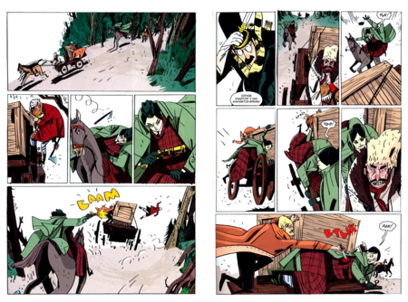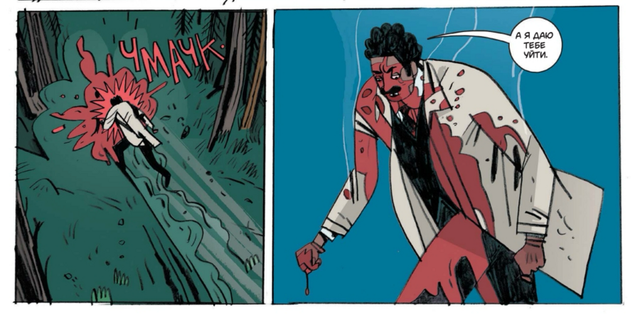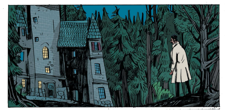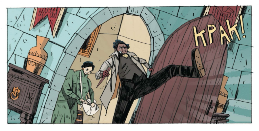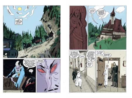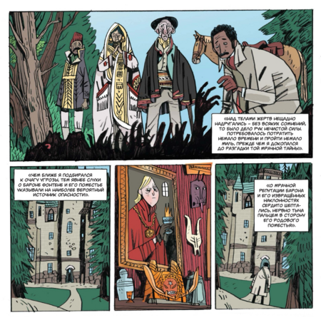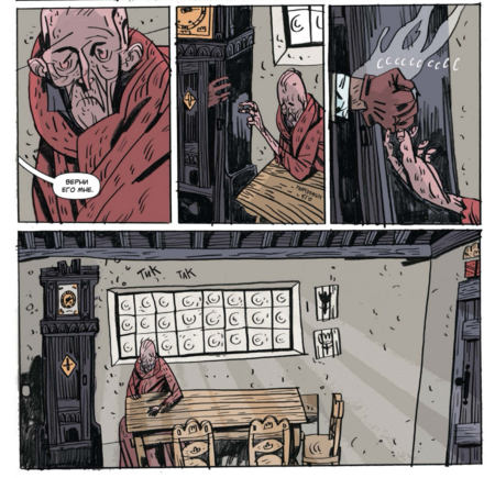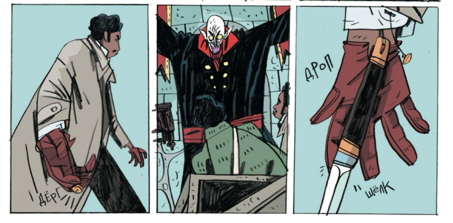 Сцены в интерьерах отведены в охристую гамму старого дерева и лака; ночные вылазки тонут в синеватых и серых плоскостях; кровь никогда не кричит «чистой» красной — чаще это кирпичный, ржавый, чтобы не выбивать читателя из общего старинного тона.