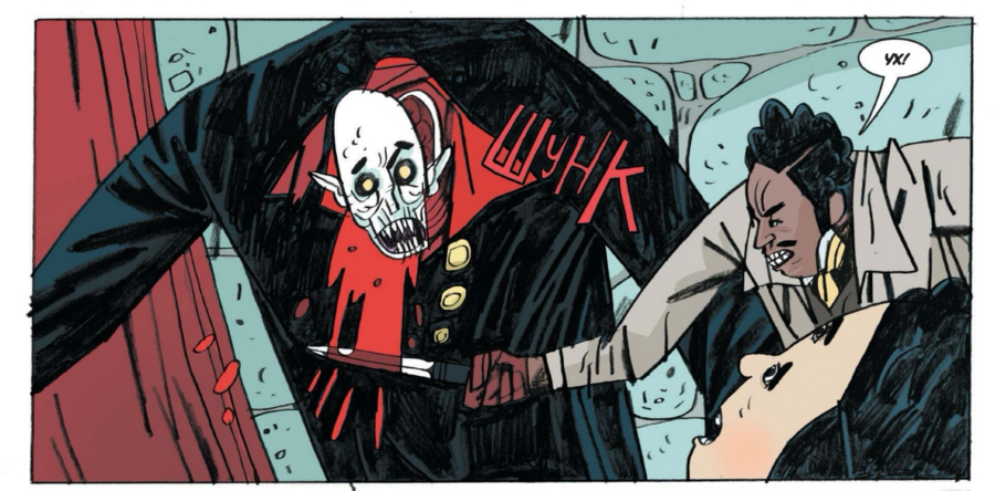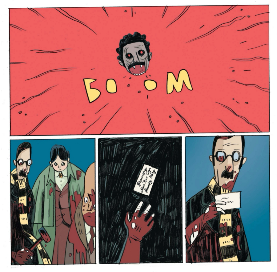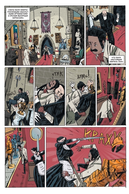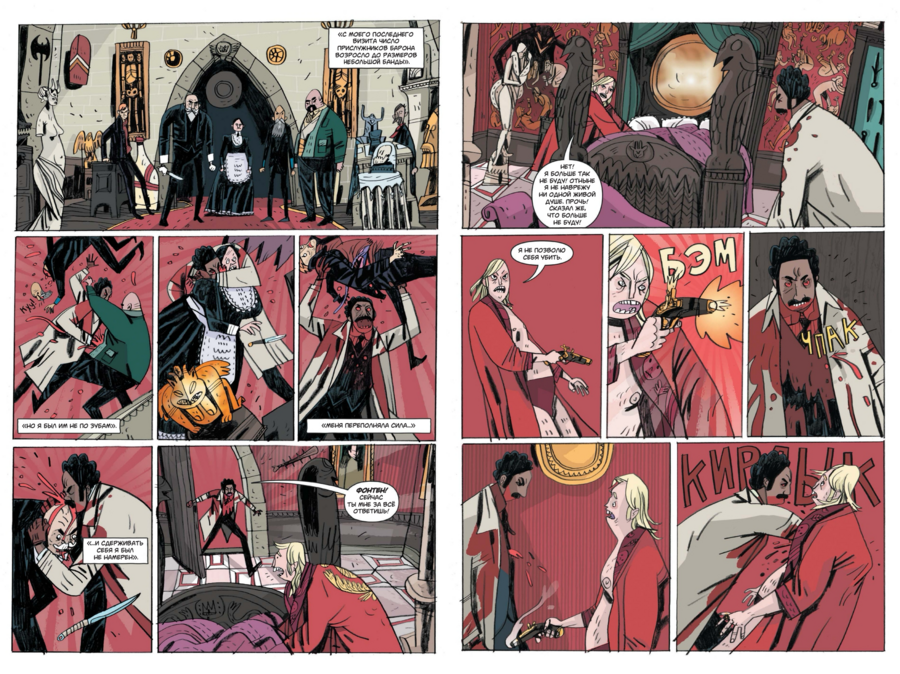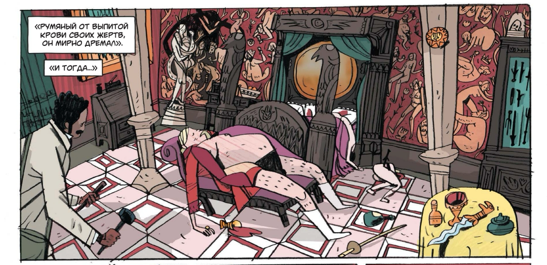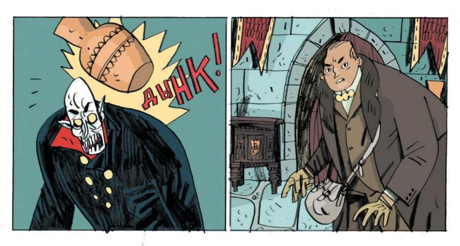 Уже первая сцена — штурм спальни вампира — ставит ритм: бурлескная суета в костюмах, тяжёлая мебель, «кровавая победа», сопровождаемая вежливой старорежимной вальяжностью героев. Эти контрасты — фирменная пружина книги.