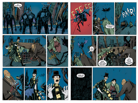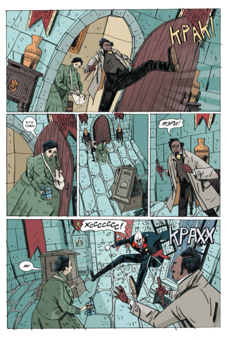 Визуальный язык «Фальконспира» — это тонко собранный визуальный «диалог» двух творческих темпераментов. От Миньолы здесь — композиционная строгость, музейная любовь к артефактам, умение работать молчанием и массой чёрного; от Джонсон-Кадуэлла — студийная спонтанность, «живой» контур, гротеск в пластике фигур, внимательность к бытовой фактуре и к микроритмам страницы. На уровне примеров это проявляется буквально в каждой сцене: драка с вампиром, где «кровавая победа» соседствует с безупречным викторианским гардеробом; пустые коридоры и лестницы, где воздух «гудит» тишиной; короткие, тяжёлые SFX, ставящие точку в жесте; глухая палитра, которая держит мир в режиме «старого дома» и тем самым усиливает и страшное, и смешное.