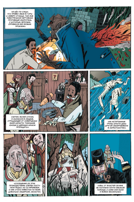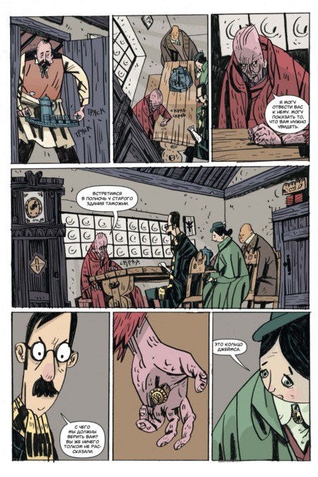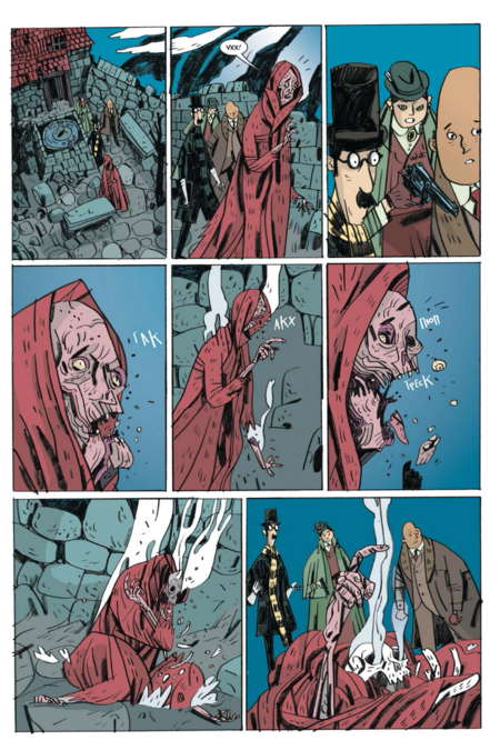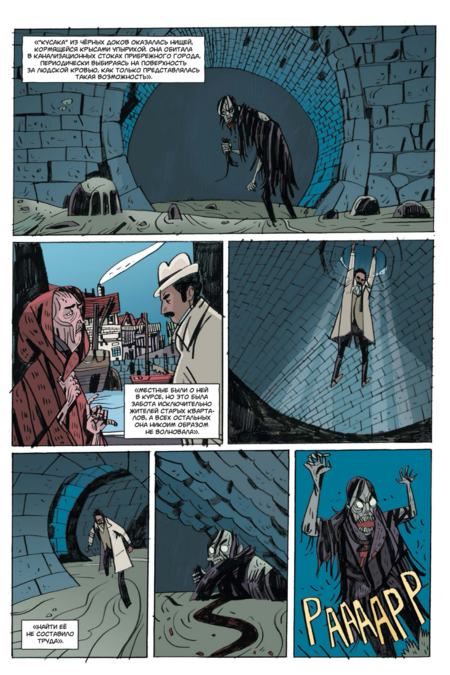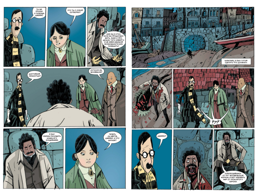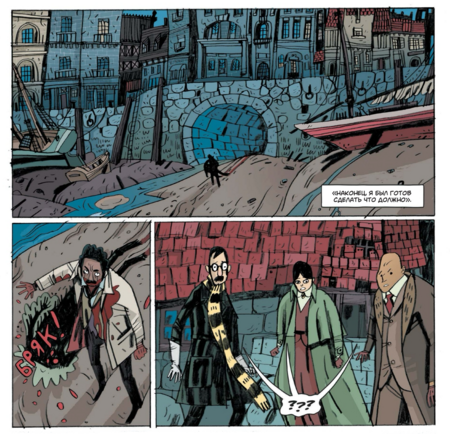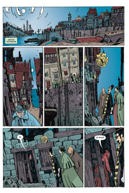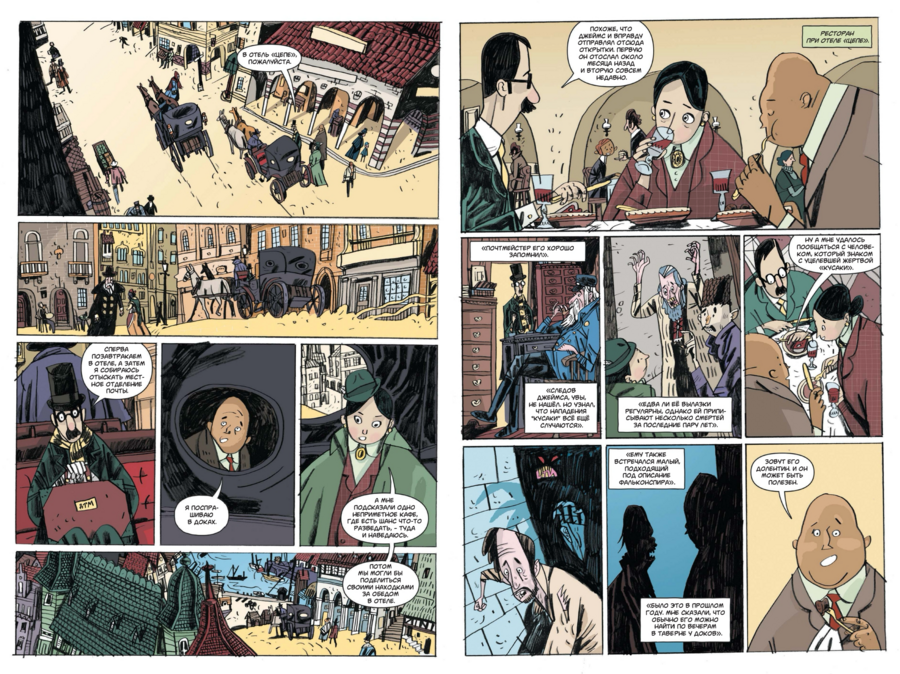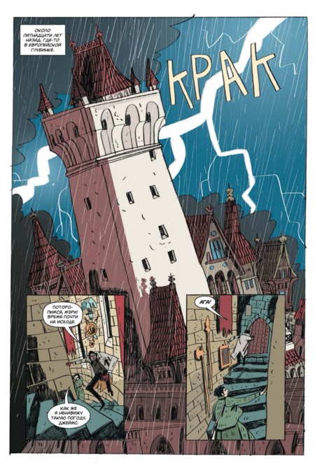 Хотя внутренняя картинка — полностью «вориковская», проект остаётся узнаваемо «миньоловским» не только по составу команды, но и по обложке. Плоские массы тьмы, крупные силуэты архитектуры, лаконичная игра контуром и пустоты, тёплый акцент цвета на ключевых деталях — это та самая дисциплина, с которой «Hellboy» и родственные книги жили уже много лет. На уровне бренда это сразу «ставит печать качества» и точно коммуницирует жанр: викторианская страшная история с иронией, стилизованная под «старые» приключенческие романы и ходы немого кино.
