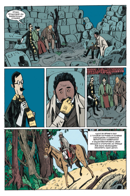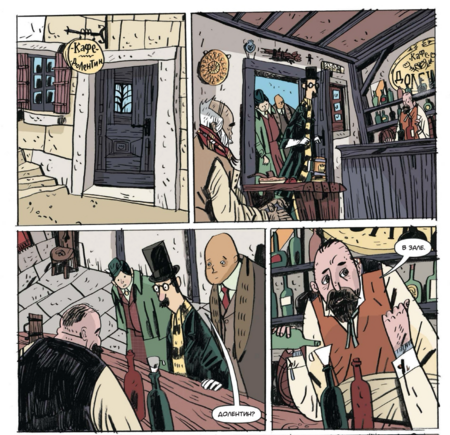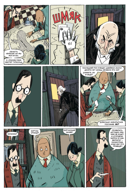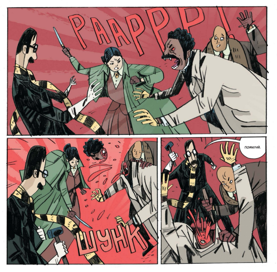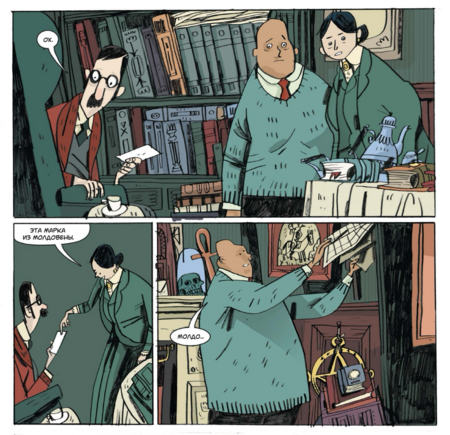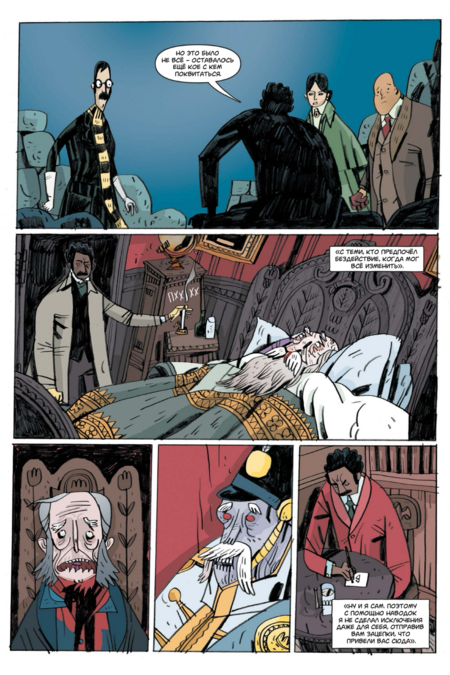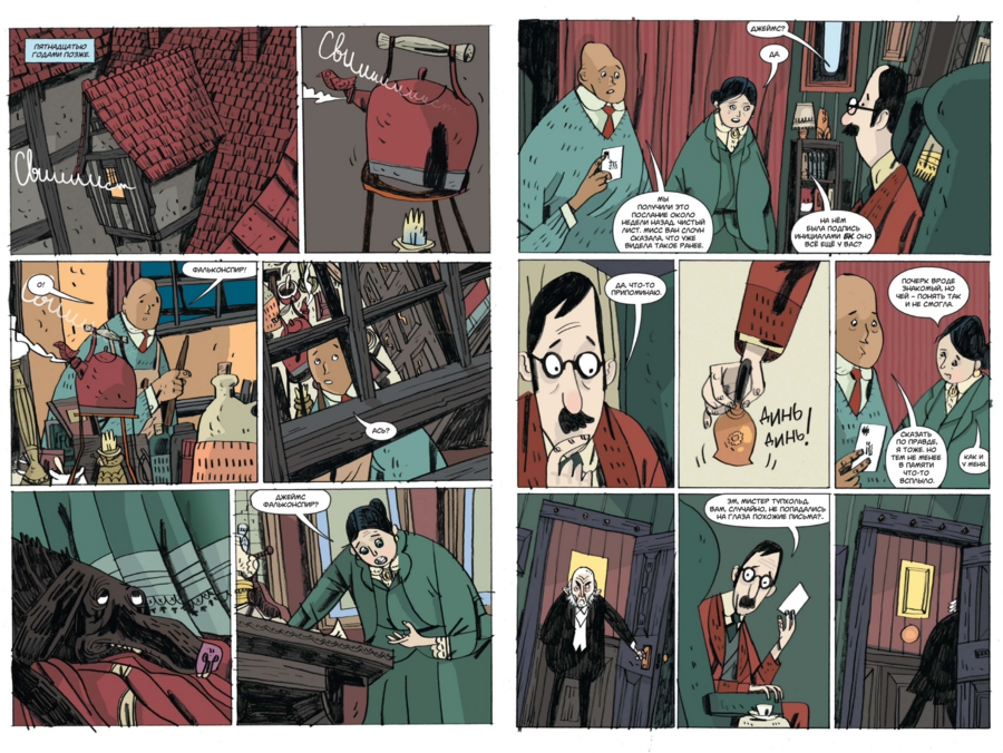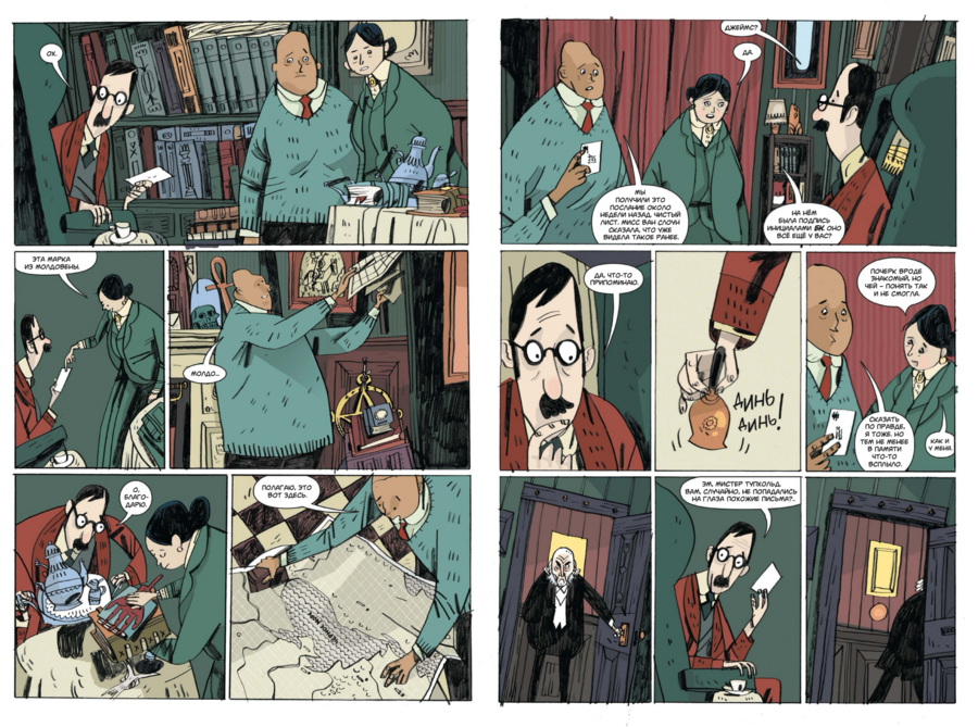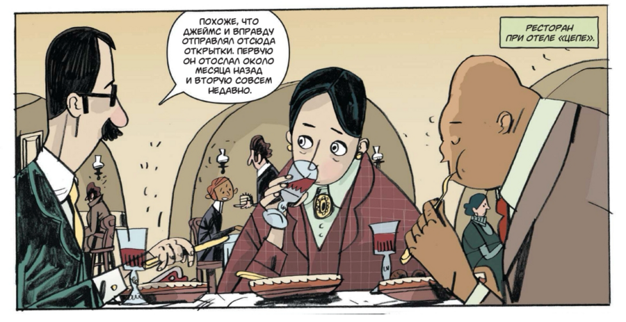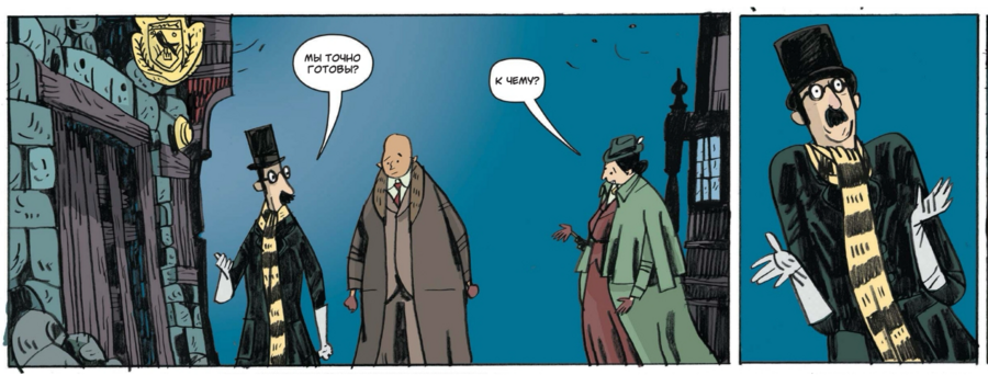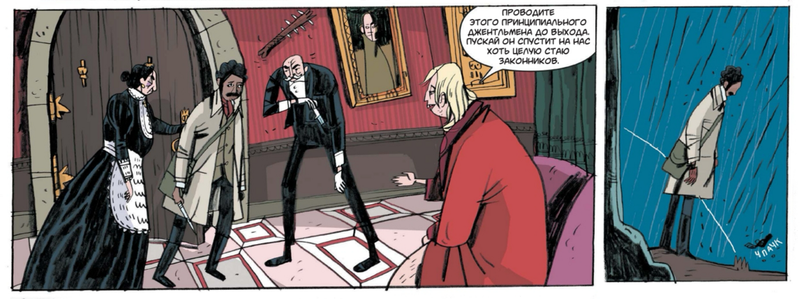 Такой выбор поддерживает жанровую «викторианскую» атмосферу и, что важно, оставляет пространство для шутки: когда появляется смешной визуальный акцент, он считывается именно за счёт общей глуши. Рецензенты справедливо видят в этом «плоскую изысканность» и «потеряться-в-уголках» — при внешней простоте в разворотах полно теневых «карманов», куда хочется вглядываться.