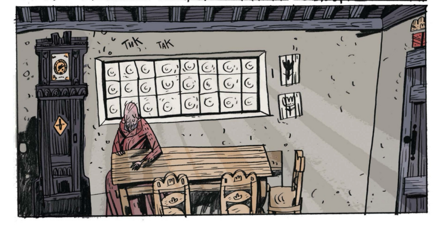 В одном из ответов художник признаётся, что часто «пересобирает» из памяти реальные вещи — скажем, громоздкий шкаф друга превращает в гигантские «часы-чудовище» и переносит их в кадр. Это приём «комнаты-персонажа»: интерьер в книге не менее говорящий, чем люди.