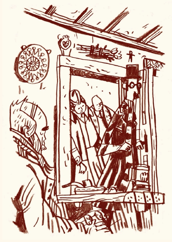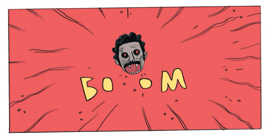 Именно поэтому его рисунки и придуманные им миры легко выдерживают как чистую ужастику, так и смешение ужаса с гротеском и сарказмом. Здесь важен ещё один момент: у Миньолы есть редкая авторская дисциплина — он умеет отсекать второстепенное и сводить кадр к нескольким опорным знакам, благодаря чему каждый разворот работает как плакат, а каждый силуэт читается мгновенно. Всё это важно для «Фальконспира» хотя бы потому, что даже когда он не рисует внутренние страницы, его эстетика диктует рамку, тон и ритм проекта, а обложка в «меньоловских» плоских пятнах чёрного и тёплого цвета заранее задаёт атмосферу чтения.