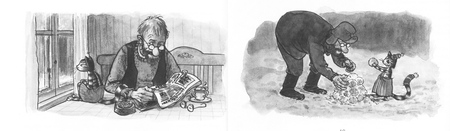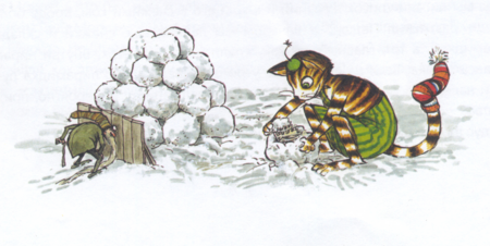 Автор ловко использует белый, не только чтобы показать зимний пейзаж, но и для того чтобы избавиться от надобности изображать фон и обратить все наше внимание на персонажей и их действие Нурдквист искусно применяет белый цвет, не только создавая атмосферу зимних пейзажей, но и намеренно упрощая фон, чтобы сосредоточить внимание зрителя исключительно на персонажах и их действиях.