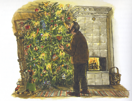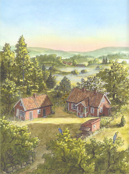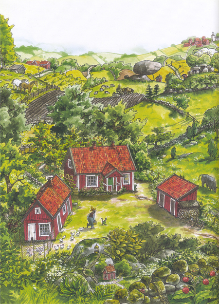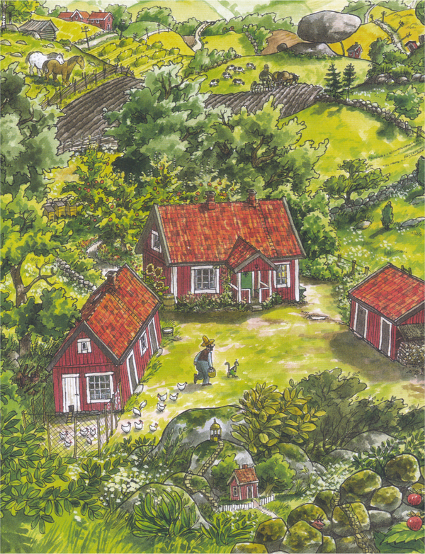 Свен Нурдквист использует близкие по тону цвета, благодаря чему его иллюстрации сливаются в единое гармоничное полотно с мягкими, едва уловимыми контрастами. Такой подход позволяет создавать цельное визуальное восприятие и увлекать читателя в путешествие по деталям, заставляя взгляд блуждать по картинке в поисках новых интересных элементов