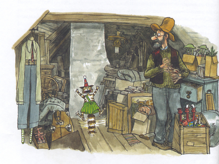 Прием, который можно назвать «историей внутри истории», является визитной карточкой Нурдквиста. Он создает на иллюстрации дополнительную динамику — как визуальную, так и нарративную. Одним из ключевых элементов здесь выступают крошечные существа — мюклы, которые прячутся на страницах книг. Эти забавные персонажи, ведущие свою повседневную жизнь со своими домиками и делами, добавляют второстепенное движение. Они заставляют читателя задержаться на иллюстрации, вглядываться в детали, придумывать их истории, таким образом, незаметно разветвляя сюжет и углубляя повествование.