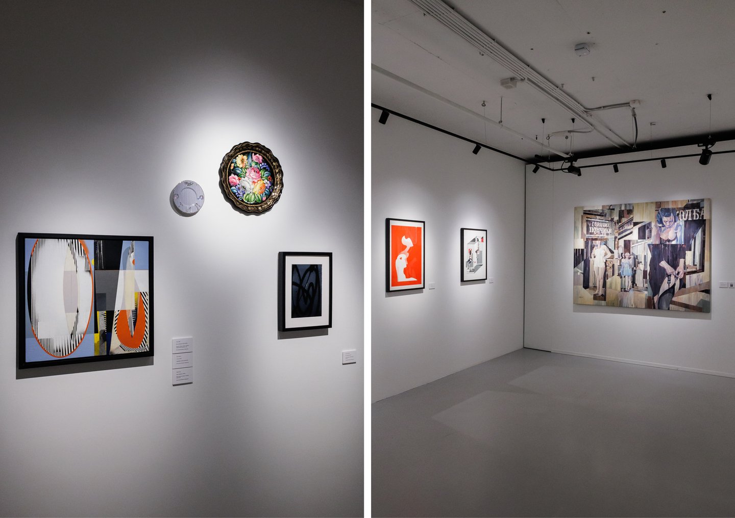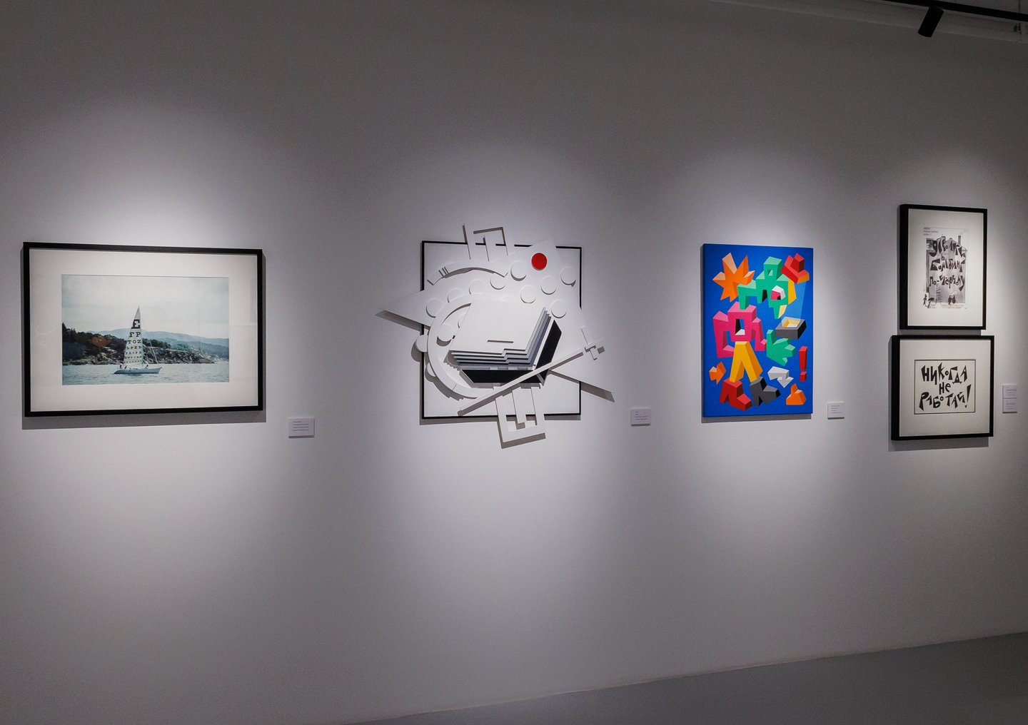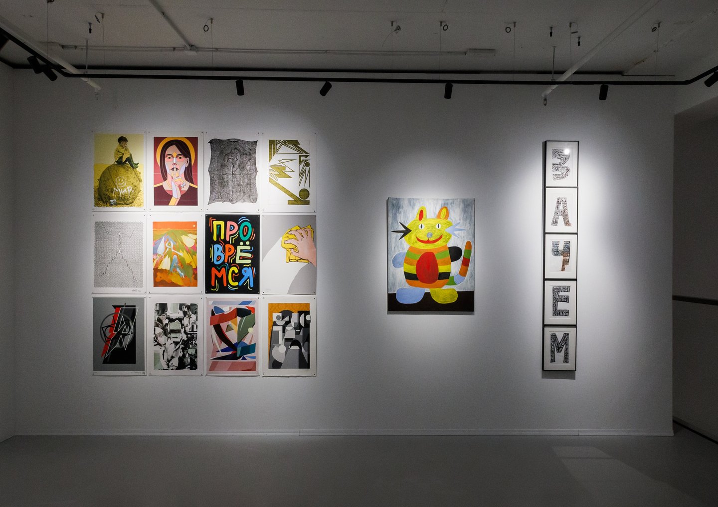 Экспозиция входной точки с работами Миши Most, Владимира Абиха и Димы Retro