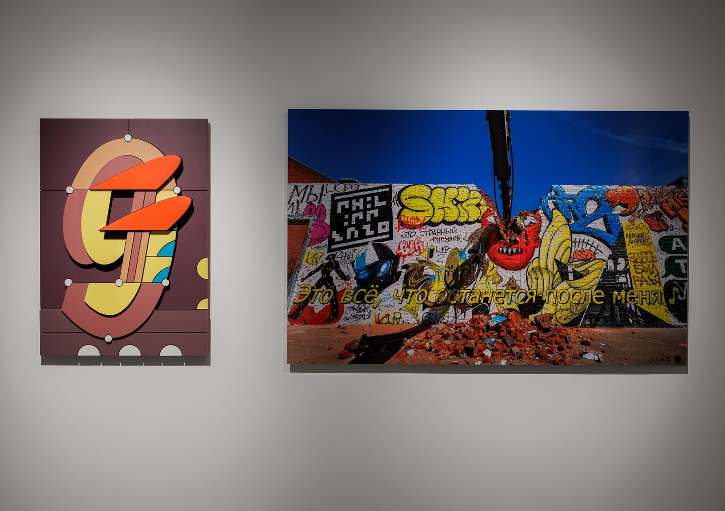 Своеобразным «прологом» служит инсталляция «Иллюзия» (2018) Дмитрия Аске из коллекции Фонда Ruarts. Монументальная фигура боксера, составленного из кубов, явно готовится разрушить кирпичную стену. Зачем? Хочет открыть путь для зрителей? Или сообщает об уличных художниках как о свободолюбивых творческих единицах, отрицающих каноны и границы в искусстве? Рассматривая инсталляцию, в особенности ее название, можно даже предположить, что маргинальность уличного искусства, как многие думают, — это иллюзия.
