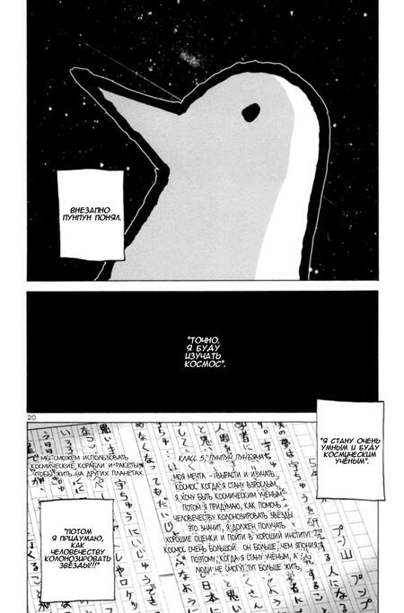 Пунпун в начале манги предстаёт мальчиком-идеалистом, который имеет мечту, предстающую идеальной, хотя и очень далёкой. Богатство детского воображения передаётся через насыщенные детализированные фреймы и акцент на репликах главного героя.