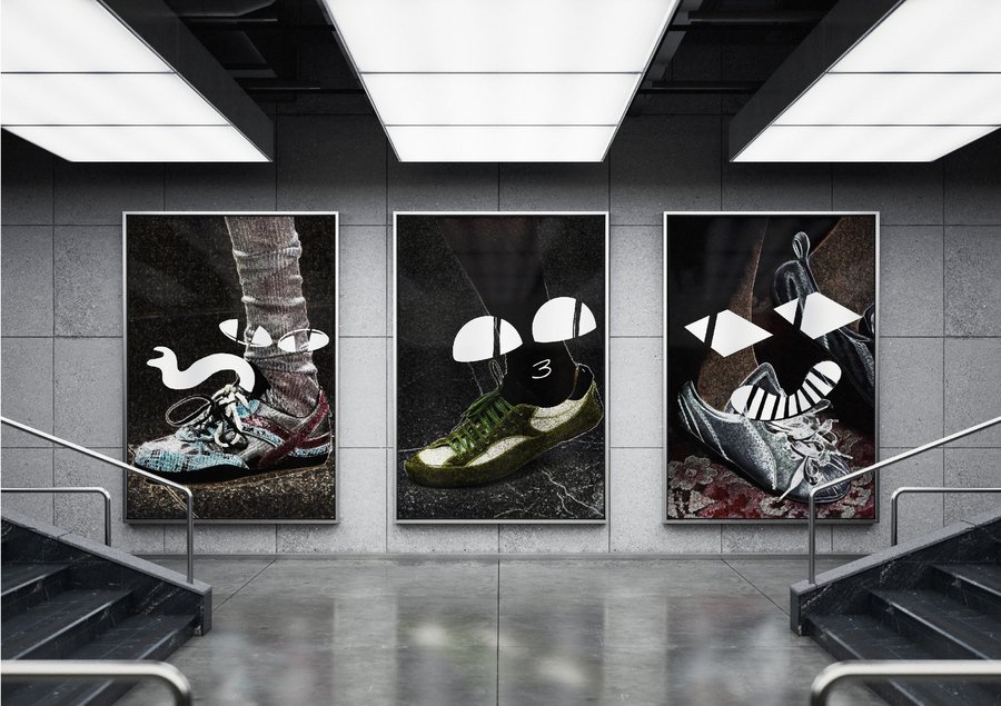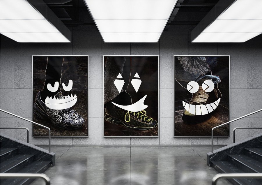 Так же, образ фигур дополняют графические начертания лиц, которые передают восприятие кроссовок и их реакцию на покупателя.