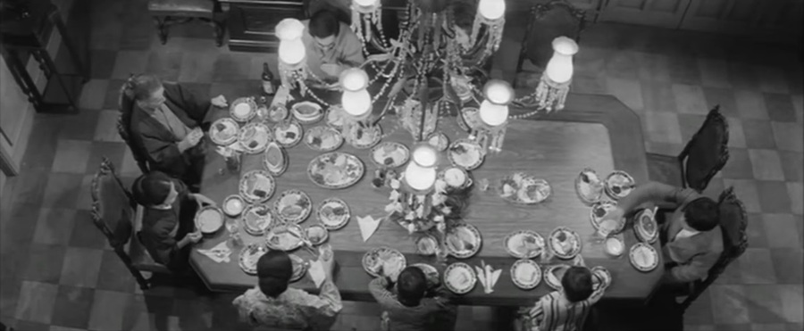 Также ключевое место в фильме занимают сцены застолий: через них Курахара показывает устроенный, жёстко регламентированный порядок семьи, в который попадает Эцуко. Композиции застолий подчёркнуто симметричны, статичны и часто снимаются широким планом. Все сидят ровно, в рамках, как экспонаты. Это театр правильности, где каждый играет социально одобряемую роль. Для Курахары еда — это не бытовой элемент, а символ контроля тела и поведения: она задаёт ритуальный порядок, превращает дом в механизм дисциплины, противопоставляет социальную вежливость внутренним импульсам Эцуко.
