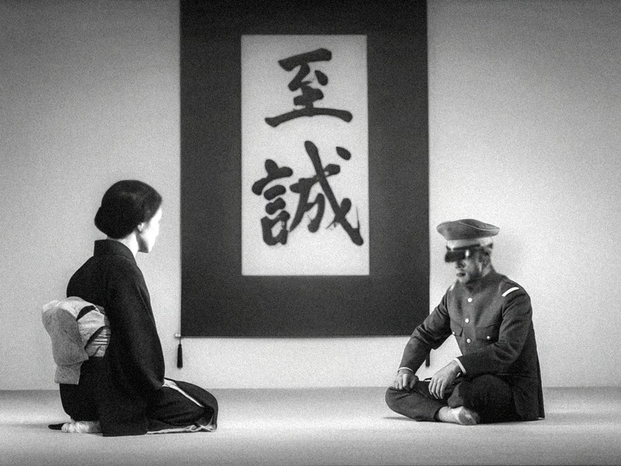 Плакат с иероглифом «Верность» на стене — ключевой символ фильма. Для лейтенанта Синдзи Такэяма (и для самого Мисимы) это не просто слово, а закон жизни — преданность долгу, императору и собственным принципам. Плакат висит как напоминание о клятве, которую герой дал себе и своей стране. Его присутствие в каждом кадре подчёркивает, что верность для Синдзи важнее жизни.