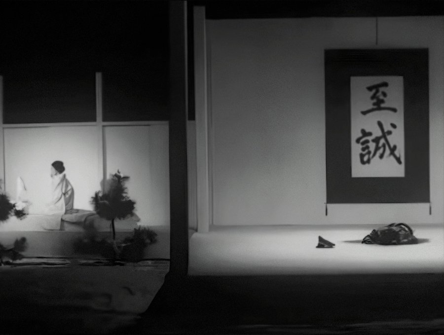 Медленные движения Такэямы и Рэйко (его жены) напоминают игру актеров традиционных японских театров Но и Кабуки, где каждый шаг — часть священнодействия. Даже бытовые сцены (например, когда Рэйко помогает мужу одеться) выглядят как элементы обряда. Лицо Мисимы в роли Такэямы почти неподвижно, как маска актера Но — символ отрешения от личных эмоций ради верности долгу.