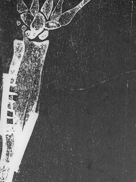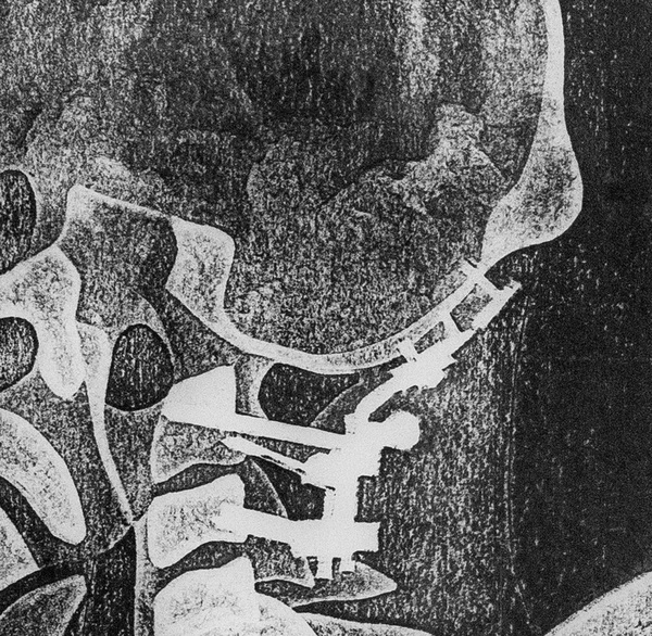 С развитием медицины все больше людей могут позволить себе импланты или металлические конструкции, помогающие работе костей и мышц. Это становится инородным телом внутри человека, что особенно заметно на рентгене. На снимках эти приспособления имеют белый цвет, что значительно отличается по цвету от остальных органов и скелета. Я решила подчеркнуть эти замененные части человеческой опорно-двигательной системы с помощью печати. Для имитации рентгеновского снимка я использовала прозрачный пластик.