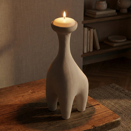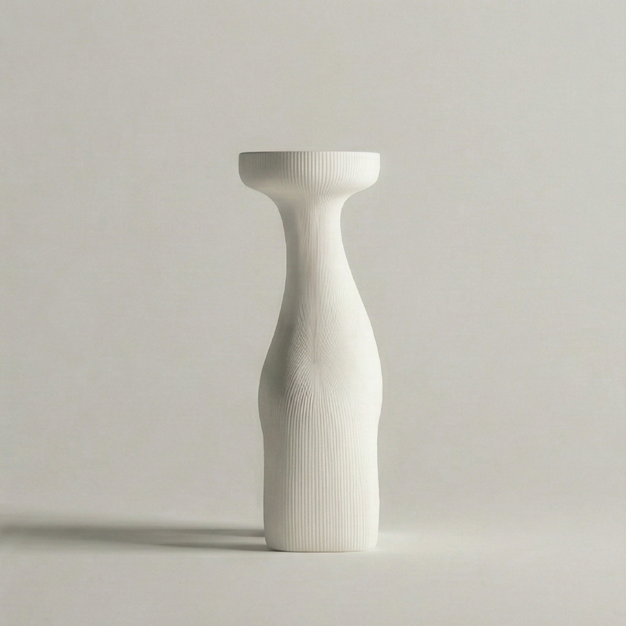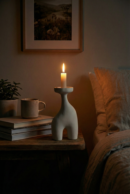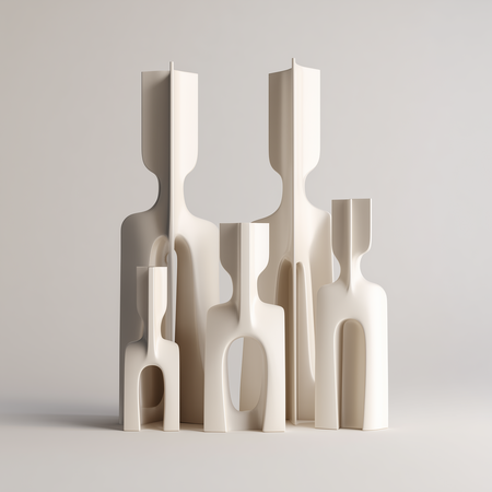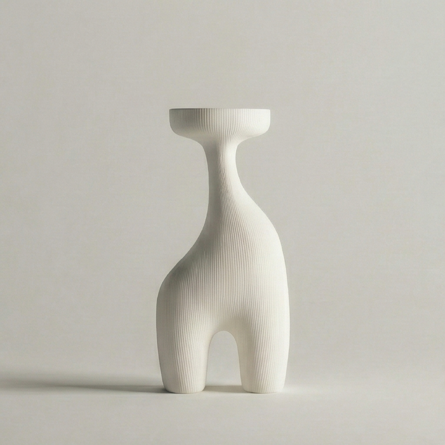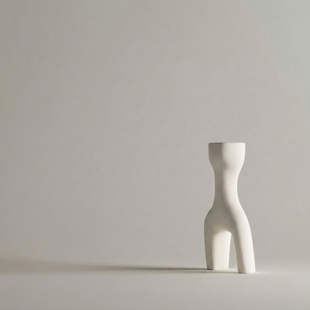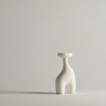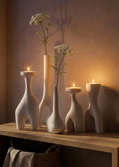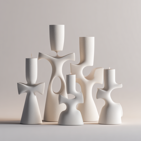 «A cohesive collection of five modern minimalist candleholders inspired by the human form in a non-literal, postmodern way simplified, slightly abstract sculptural forms where gestures / silhouettes are subtly suggested but not obvious; external gesture and body language. 3D-printed plastic (FDM/SLA look), matte or satin finish, clean seams, soft chamfers, precise tolerances, product design aesthetic. Studio product photography, neutral background, soft diffused lighting, high detail, consistent design language across all five pieces, arranged as a set».