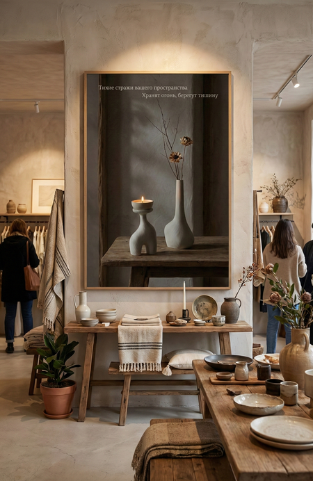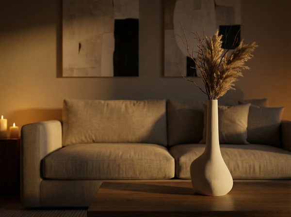 «Создай изображение интерьера с этими объектами. в вазы с узким горлышком поставь цветы, в подсвечники с широкой площадкой сверху поставь свечи-плошки. создай приятную романтическую атмосферу, интерьер должен быть в стиле джапанди, время — вечер сразу после заката»