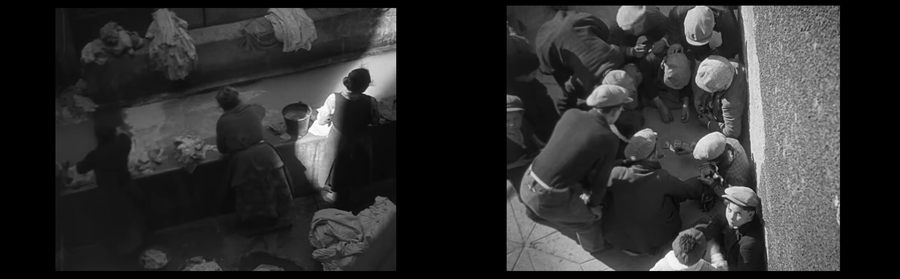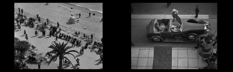 Например, в фильме «По поводу Ниццы» (1930г) Жан Виго часто использует ракурс сверху, как бы наблюдая за тем, что происходит в Ницце. Примечательно, что этот ракурс используется и при съемке пляжей, набережных, площадей, по которым гуляют богатые, и при съемке узких проулков бедных районов, в которых трудятся люди. Так режиссер показывает документальность кинокартины.