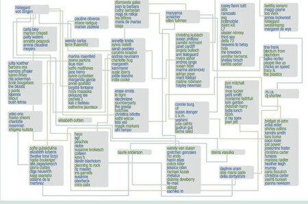большую роль в этом проекте игра карта her noise, она представляет из себя запутанное и неточное руководство об истории женщин в музыке и звуке. Она не полная, не структурированная, в ней нет иерархии и нет центра. нет начала, нет конца. в карте не найти сюжетов или нарративов, поскольку это запечатленный импульс, который возник из сотен разговоров и интервью. Карту можно назвать снимком длительного процесса, воспроизводимый женщинами, где нет четкой структуры и линейности, так как это про естественность, про реальное положение девушек