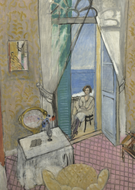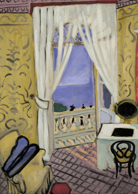 В «Интерьере в Ницце» (1921) изображена комната с расслабленной атмосферой, через большие открытые двери виднеются пальмы и песок солнечного Средиземноморского побережья. В интерьере сидит фигура, погружённая в размышления. Матисс использует яркие цвета и декоративные узоры на мебели и текстиле, которые создают ритм и направляют взгляд по полотну. Свет, проникающий через открытые двери, мягко освещает фигуру, мебель и элементы интерьера, подчёркивая объём и создавая ощущение глубины. Композиция организована так, что интерьер плавно соединяется с внешним пространством, а цвет и свет формируют декоративное, гармоничное и камерное ощущение сцены.