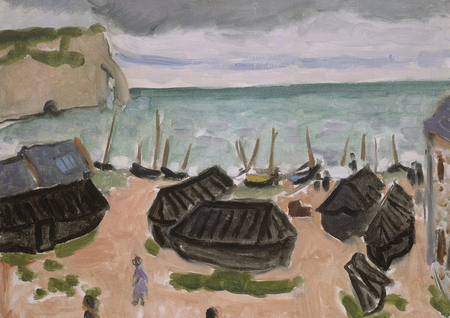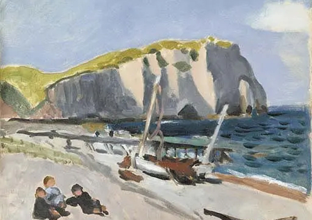 Утёсы Аваль, рыбаки — Этрета (Aval Cliffs, Fishermen, Étretat, 1920). На переднем плане изображены фигуры рыбаков, работающих у берега. За ними — массивный утёс Аваль, один из самых узнаваемых видов Этрета. Фигуры написаны упрощёнными пятнами, их цветовые акценты противопоставлены светлым плоскостям утёса. Световые переходы на каменной поверхности создают ощущение монументальности скалы, а контраст между вертикалью утёса и горизонталью берега организует композицию. Цвет моря — бирюзовый, с серыми рефлексами, гармонирует с небом.