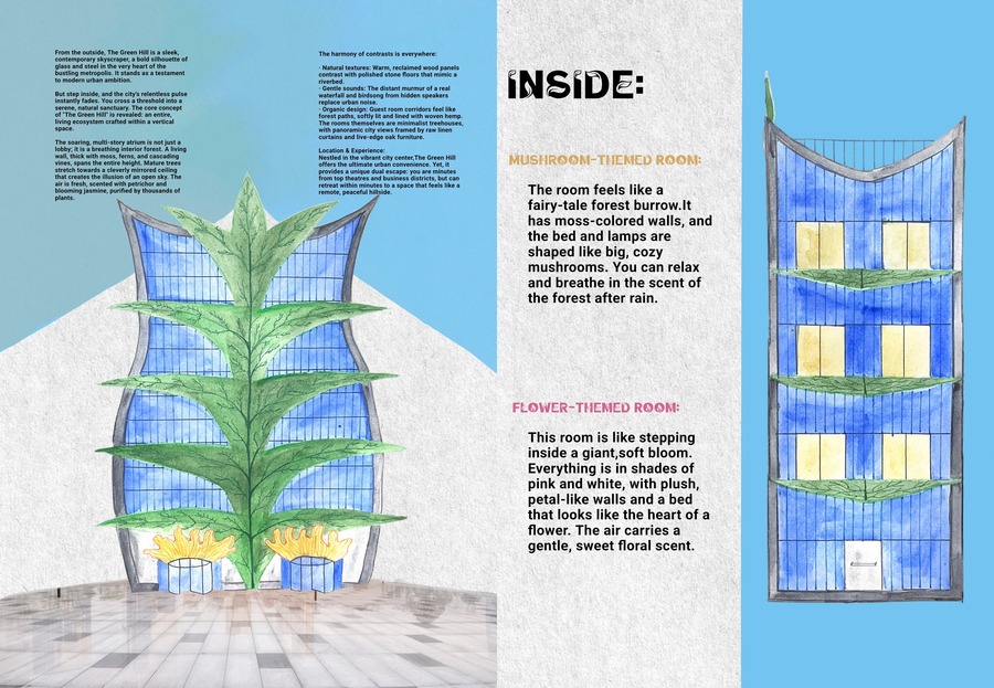 Вдохновившись необычной архитектурой Захи Хадид, был создан журнал про футуристичный отель «Зеленый холм». Его особенность — сочетание мегаполиса и природных мотивов.